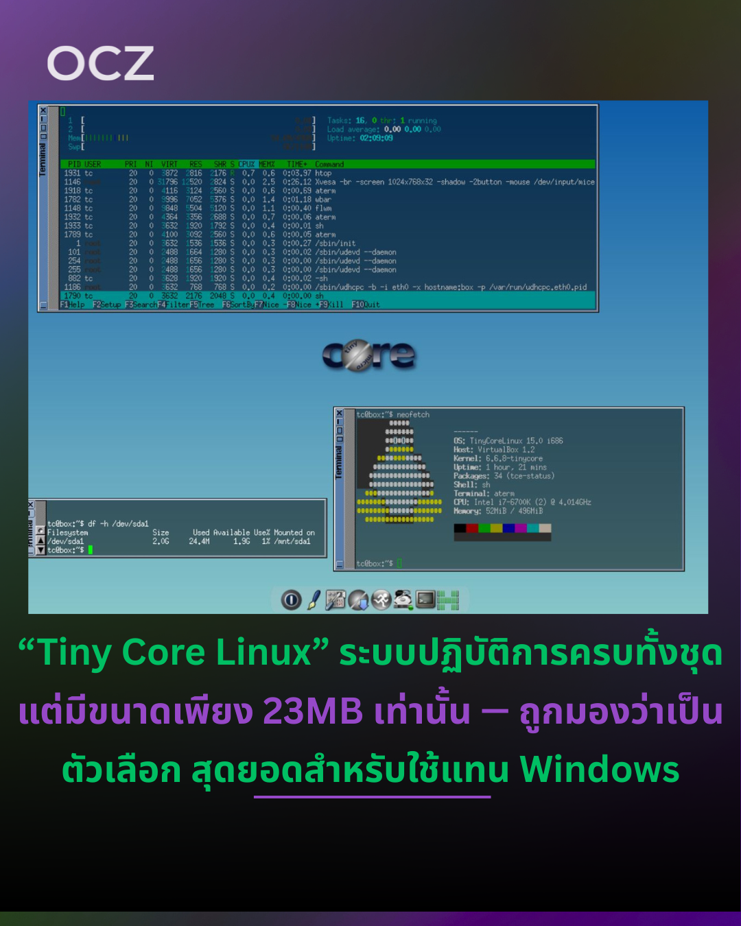 ถ้าคุณมีคอมเก่า ๆ และอยากลงระบบที่ เรียบง่ายสุดขีด—ลองดู Tiny Core Linux เป็นตัวเลือกได้เลย เพราะมันถูกมองว่าเป็น “ทางเลือกแทน Windows 11 แบบสุดทาง” ล่าสุดเวอร์ชัน 16.2 มีขนาดเพียง 23MB แต่ยังเป็นระบบปฏิบัติการที่ใช้งานได้ครบชุด