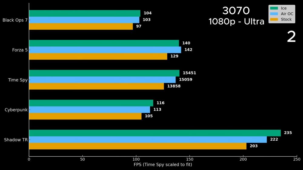 รวมแล้ว RTX 3070 ได้แรงขึ้นราว 7–16% เมื่อเทียบกับสต็อก โดยช่องว่างระหว่างโอเวอร์คล็อกลมกับระบบติดลบนั้นเหลือไม่มากแล้ว