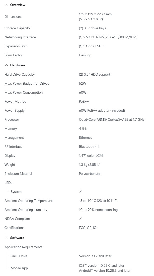 UNAS 2 รุ่นเล็กกว่า เน้นใช้งานไม่หนัก รองรับฮาร์ดดิสก์ 3.5 นิ้ว 2 ช่อง ตัวเครื่องขนาด 135 × 129 × 223.7 มม. แม้จะไม่มี Hot-Swap และไม่รองรับ NVMe แต่ก็ใช้สเปกเดียวกันทั้ง CPU, RAM และระบบเครือข่ายเหมือนรุ่น 4-Bay โดยกินไฟน้อยกว่าที่ 60 W ผ่าน PoE++