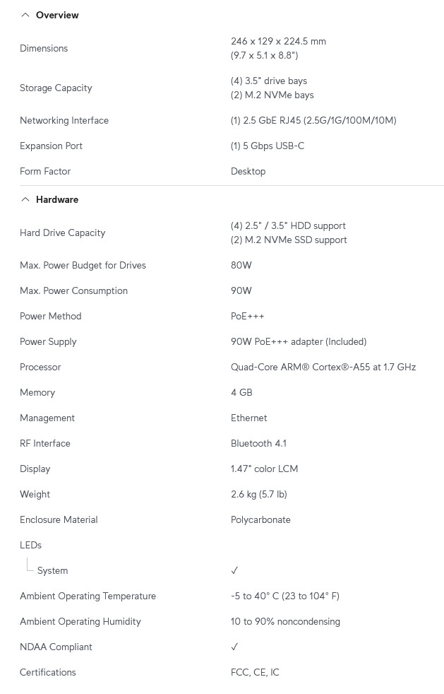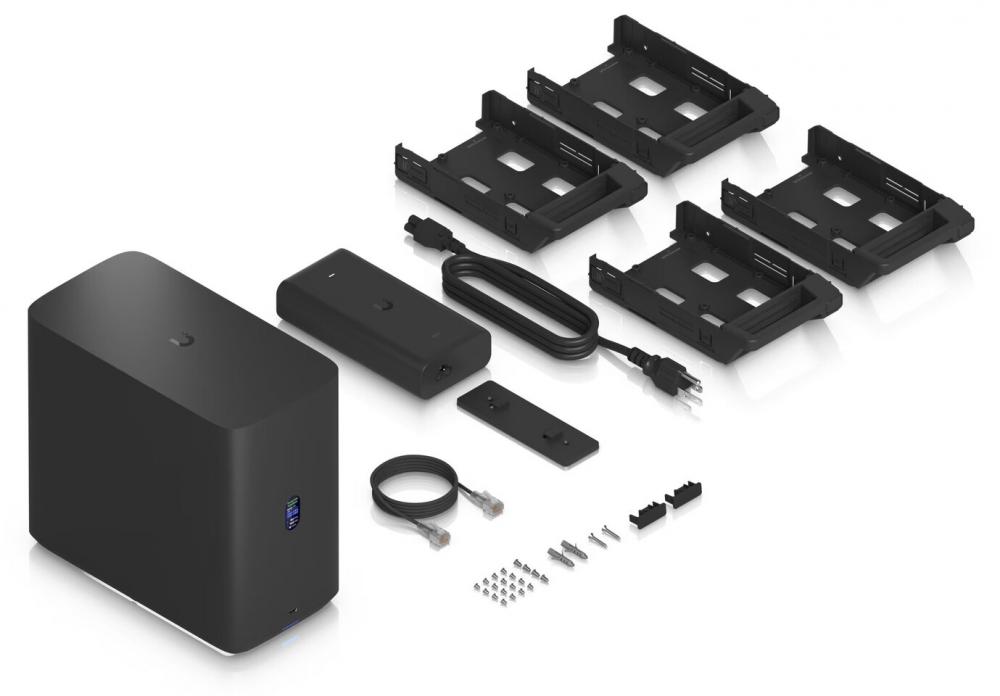 UNAS 4 รุ่นท็อป มาพร้อมซีพียู Arm Cortex-A55 แบบ Quad-core 1.7 GHz จับคู่กับ RAM 4 GB รองรับทั้งฮาร์ดดิสก์/SSD ขนาด 2.5 นิ้ว และ 3.5 นิ้ว แถมยังมีสล็อตสำหรับ M.2 NVMe SSD อีก 2 ช่อง ตัวเครื่องมีขนาด 246 × 129 × 224.5 มม. น้ำหนัก 2.6 กก. จุดเด่นคือ รองรับ Hot-Swap, การตั้งค่า RAID, และฟีเจอร์ Hot-Spare ขณะทำงาน ใช้พลังงานสูงสุด 90 W ผ่าน PoE+++