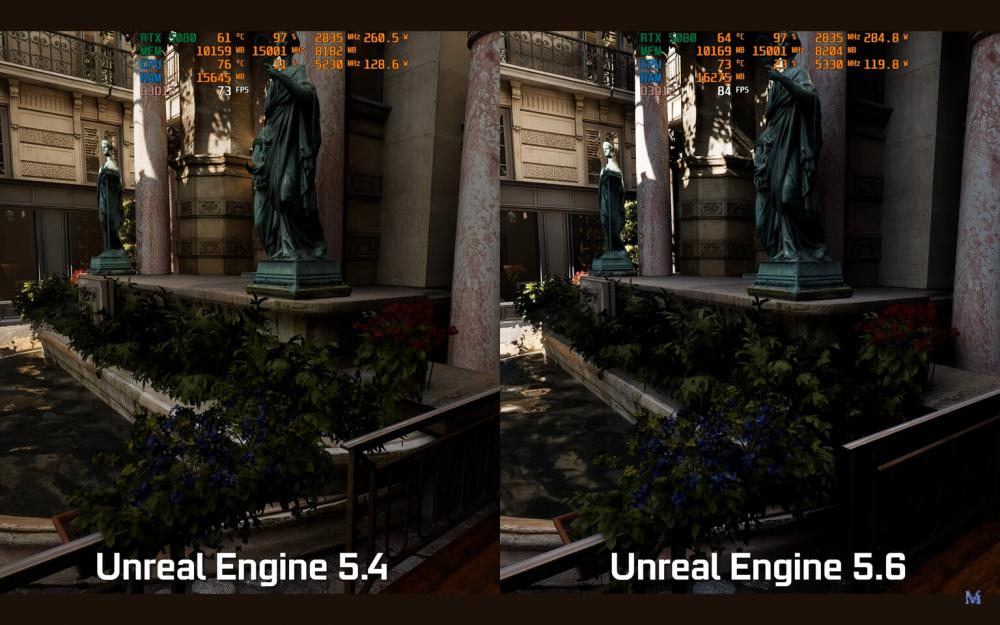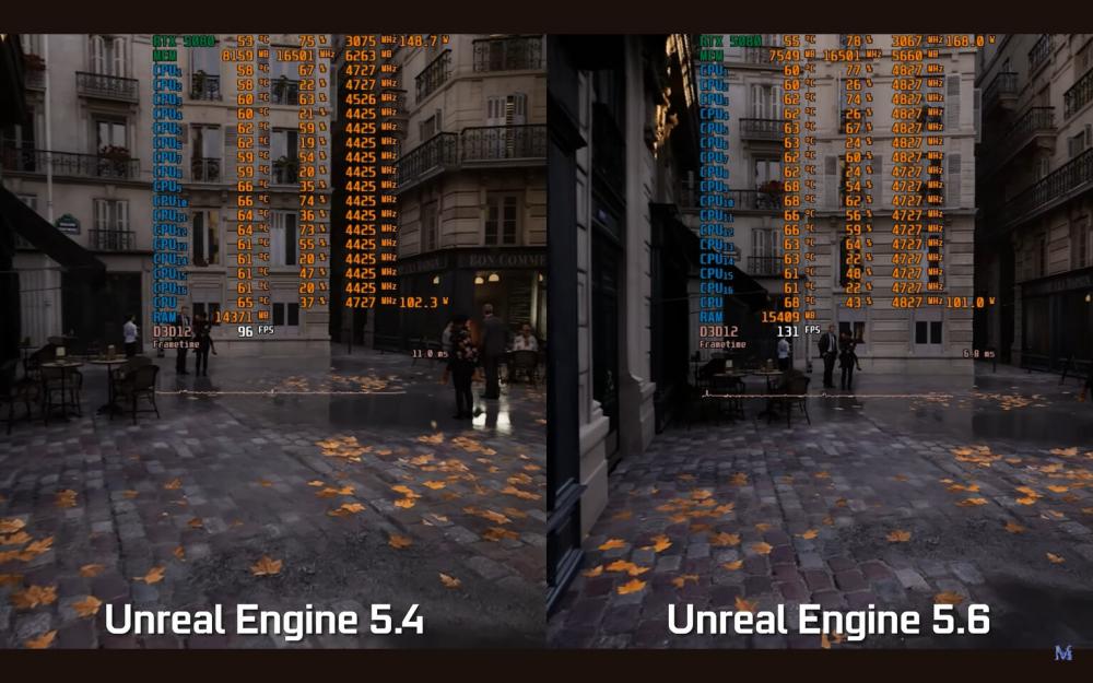 ด้วยวิดีโอเปรียบเทียบใหม่จากช่อง YouTube MxBenchmarkPC ทำให้ Paris Tech Demo โดย Scans Factory ผ่านการทดสอบบน RTX 5080 โดยทำงานควบคู่กันใน Unreal Engine 5.6 และเวอร์ชัน 5.4 พร้อมเปิดใช้งานฮาร์ดแวร์ Lumen ด้วยวิธีนี้ เราจึงได้เห็นสิ่งที่ Epic Games ได้ทำกับการปรับแต่งฮาร์ดแวร์ในเวอร์ชันล่าสุด ในสถานการณ์ที่จำกัดด้วย GPU การอัปเกรดจะชัดเจนทันที โดยอัตราเฟรมเพิ่มขึ้นถึง 25% ขอบคุณการใช้ทรัพยากรกราฟิกที่ดีขึ้น แม้ว่าจะหมายความว่าการ์ดจะใช้พลังงานเพิ่มขึ้นเล็กน้อยเพื่อส่งมอบการเพิ่มประสิทธิภาพ เมื่อ CPU กลายเป็นคอขวด Unreal Engine 5.6 จะก้าวไปข้างหน้าอย่างแท้จริง โดยปรับเวลาเฟรมให้ราบรื่นขึ้นและส่งมอบผลงานที่สูงขึ้นถึง 35% เมื่อเทียบกับรุ่นเก่า นอกเหนือจากตัวเลขดิบแล้ว เวอร์ชันใหม่ยังปรับปรุงภาพของ Lumen อีกด้วย แสงให้ความรู้สึกแม่นยำมากขึ้น และการสะท้อนดูคมชัดขึ้นในขณะที่ยังคงระดับของเงาและรายละเอียดแสงเรย์เทรซซิ่ง โดยรอบที่นักพัฒนาคาดหวังไว้ Unreal Engine 5.6 เปิดตัวอย่างเป็นทางการเมื่อต้นเดือนนี้ หลังจากที่ Epic Games จัดงาน Unreal Fest เสร็จเรียบร้อย โดยได้เผยโฉมการปรับปรุงต่างๆ เหล่านี้มากมาย การปรับปรุงการติดตามแสงด้วยฮาร์ดแวร์ที่เร่งความเร็วขึ้นทำให้ภาระงานการส่องสว่างทั่วโลกของ Lumen ย้ายไปยัง GPU รุ่นใหม่ได้มากขึ้น และปลั๊กอิน Fast Geometry Streaming จะทำให้การโหลดโลกขนาดใหญ่ที่นิ่งสนิทนั้นราบรื่นและไม่มีการสะดุด แอนิเมเตอร์จะต้องชื่นชอบอินเทอร์เฟซเส้นทางการเคลื่อนไหวที่ปรับปรุงใหม่ ซึ่งเพิ่มความเร็วในการปรับคีย์เฟรม และโปรไฟล์อุปกรณ์ใหม่จะปรับการตั้งค่าโดยอัตโนมัติเพื่อให้ได้อัตราเฟรมเป้าหมายบนคอนโซลและพีซีระดับไฮเอนด์ เพื่อแสดงสิ่งที่เป็นไปได้ Epic ได้ร่วมมือกับ CD Projekt Red สำหรับเดโมเทคโนโลยี The Witcher IV ที่ทำงานที่ 60 FPS คงที่พร้อมเปิดใช้งานการติดตามแสงอย่างสมบูรณ์บนคอนโซล PlayStation 5 รุ่นปัจจุบัน