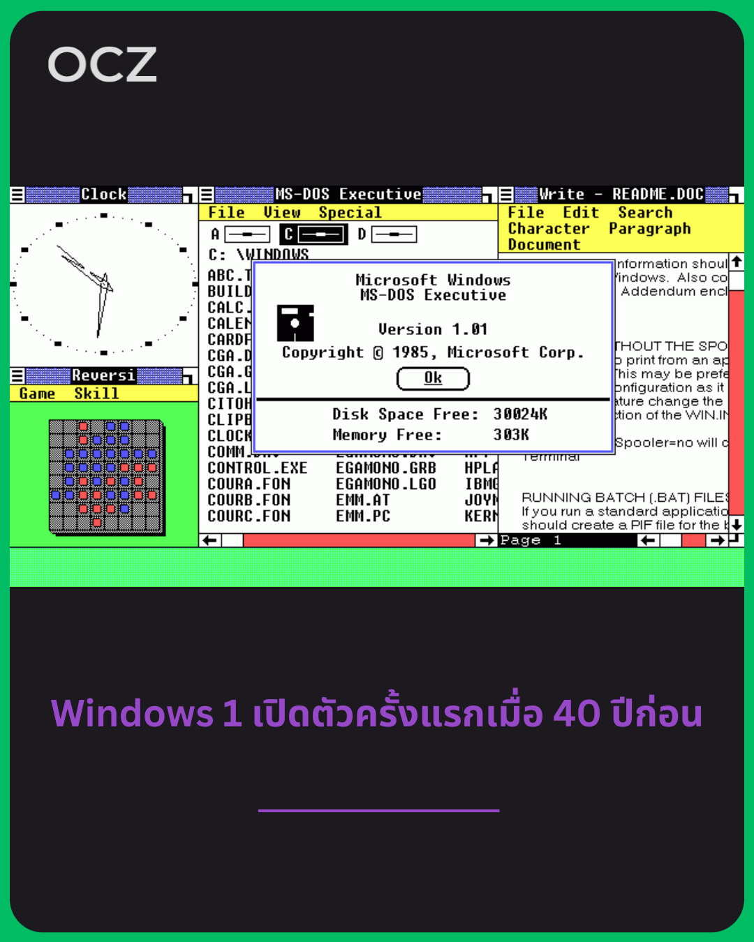 Windows เวอร์ชันแรกครบ 40 ปีแล้ว—ระบบที่เริ่มต้นจาก DOS บนเครื่องที่ใช้ซีพียู 8088 และ RAM เพียง 256 KB เท่านั้น โดย Windows 1 ใช้หน้าต่างแบบเรียงเป็นตาราง (tiled windows), เมนู และการควบคุมด้วยเมาส์ ขึ้นมาซ้อนบนแอป DOS อีกที เรียกได้ว่าเป็น “ชั้นกราฟิก” มากกว่าจะเป็นระบบปฏิบัติการเต็มรูปแบบ แต่ก็ได้วางรากฐานของชื่อ Windows ที่กำหนดทิศทางของเดสก์ท็อปพีซีจนถึงปัจจุบัน
