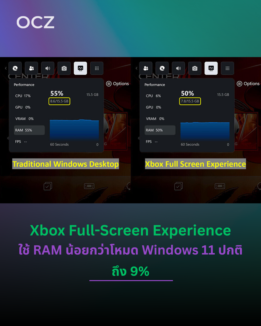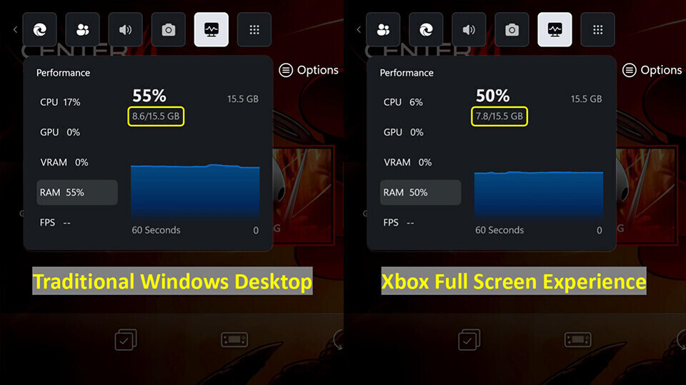 ในโหมดเดสก์ท็อป Windows 11 ปกติ ระบบใช้ RAM อยู่ที่ 8.6 GB แต่เมื่อเปิดใช้งาน Xbox FSE การใช้ RAM ลดลงเหลือเพียง 7.6 GB หรือลดลง 9.3% ซึ่ง MSI ระบุว่าเป็นความแตกต่างราว 5% ถ้าเทียบกับความจุรวมของ RAM ขนาด 16 GB แทนที่จะเทียบแค่ตัวเลขการใช้งานจริง