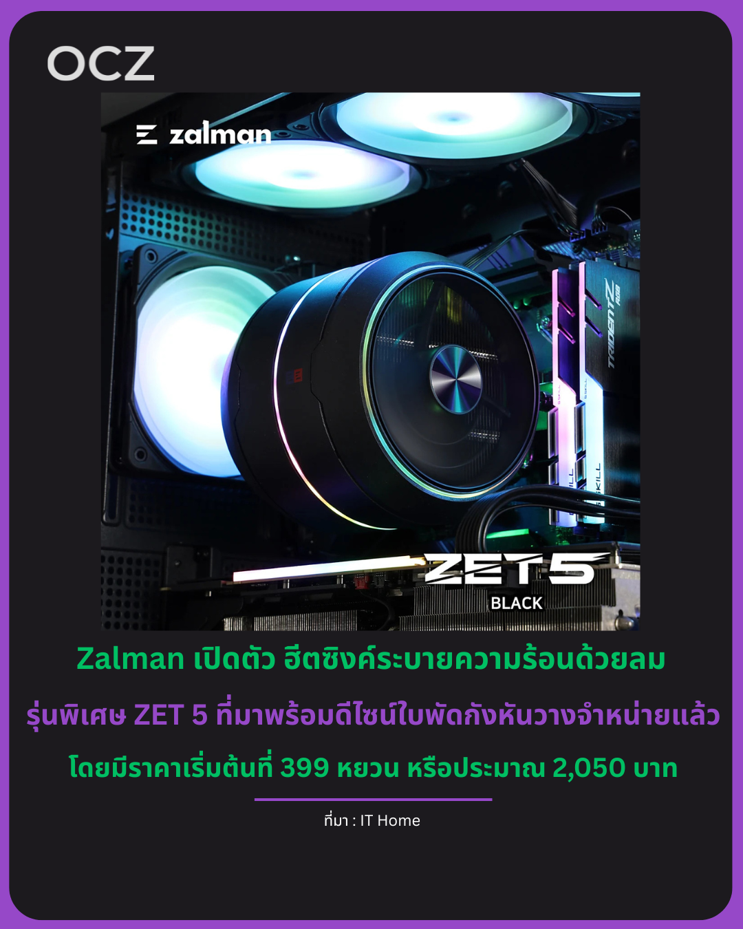 Zalman ได้ประกาศเปิดตัวฮีตซิงค์ซีพียูแบบทาวเวอร์ทรง “กลม” รุ่น ZET 5 ที่ได้แรงบันดาลใจมาจากเครื่องยนต์กังหันของเครื่องบิน โดยรุ่นสีดำมีราคา 399 หยวน (ประมาณ 2,050 บาท) และรุ่นสีขาวราคา 419 หยวน (ประมาณ 2,150 บาท)