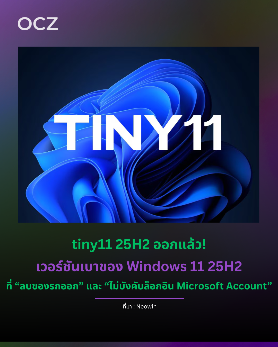 tiny11 25H2 เปิดให้ดาวน์โหลดแล้ว! เวอร์ชัน Windows 11 25H2 แบบ “ตัดของรกออก (debloated)” ใช้งานลื่นขึ้น กินทรัพยากรน้อยลง และ ไม่มีข้อจำกัดฮาร์ดแวร์ แบบ Windows 11 ตัวปกติ