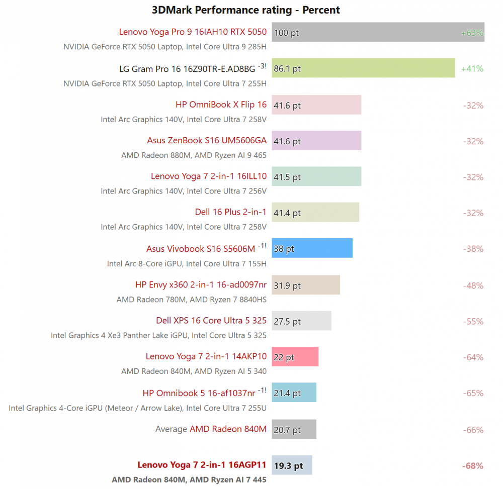 - แต่กลับแพ้ Ryzen AI 5 340 ที่ทำได้ 63.7 (บน Yoga 7 รุ่น 14 นิ้ว)