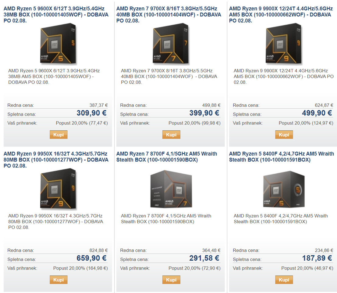 เริ่มจากด้านล่าง Ryzen 5 9600X มีราคาอยู่ที่ €310 (US$332) และทางร้านมี Ryzen 7 7600X จำหน่ายในราคา €212 Ryzen 7 9700X มีราคาอยู่ที่ 400 ยูโร (429 เหรียญสหรัฐ) ในขณะที่ Ryzen 7 7700X จำหน่ายในราคา 305 ยูโร Ryzen 9 9900X มีราคาอยู่ที่ €500 (US$536) ส่วน Ryzen 9 7900X อยู่ที่ €392 ในที่สุด Ryzen 9 9950X มีราคาอยู่ที่ €660 (US$707) เทียบกับ €510 สำหรับ Ryzen 9 7950X ซึ่งสอดคล้องกับราคาที่รั่วไหลออกมาก่อนหน้านี้จากฟิลิปปินส์ และเมื่อนำ VAT ออกแล้ว เราก็ได้ใกล้เคียงกับราคา MSRP ที่เสนอโดยผู้รั่วไหลหลายรายในช่วงสองสามเดือนที่ผ่านมา หรืออาจต่ำกว่านั้นเล็กน้อยด้วยซ้ำ หากมีสิ่งใด ดูเหมือนว่า AMD จะไม่เพิ่ม MSRP มากกว่าโปรเซสเซอร์ Ryzen ซีรีส์ 7000
